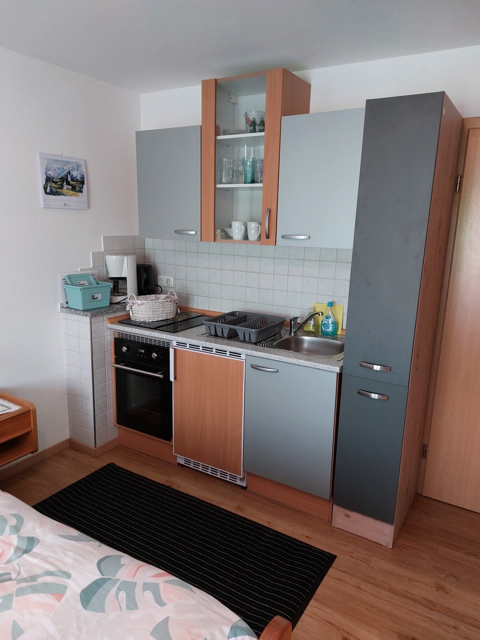 im Obergeschoß mit Schlafzimmer, Küchenzeile mit Herdplatte Backofen Kühlschrank, Sitzecke, TV, Dusche und WC, WLAN-Internet und Balkon mit schöner Aussicht.
